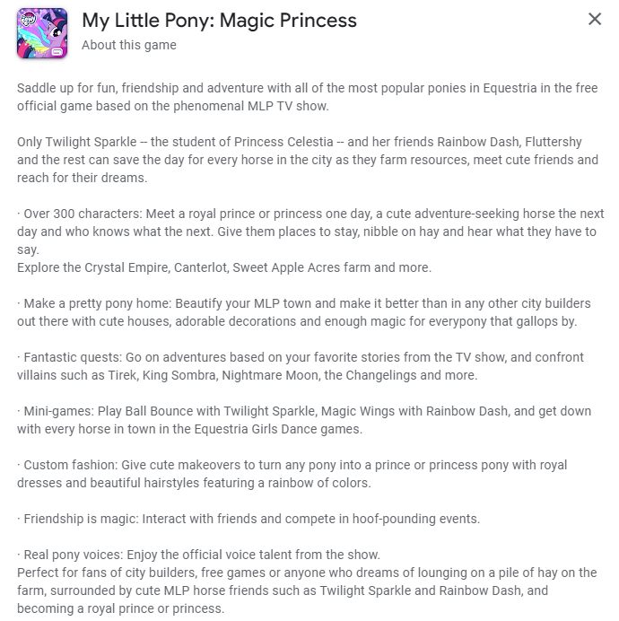 The gameplay screenshots for My Little Pony: Magic Princess show that the content is visually directed to children based on the colorful pony animated graphics. At the beginning of the game, players are shown a cinematic explanation of the plot of the game. The game's aesthetics, graphics, and presentation capture the essence of the show along with the dialogue being voiced by the same cast as the cartoon. The premise of the game is to rebuild Ponyville, collect coins, and defeat nightmare moon to make it the most magical place while playing engaging mini-games with the ponies. The music and sound effects are those of a composed musical medley. The animation is nostalgic to the animated series with delightful visual components.