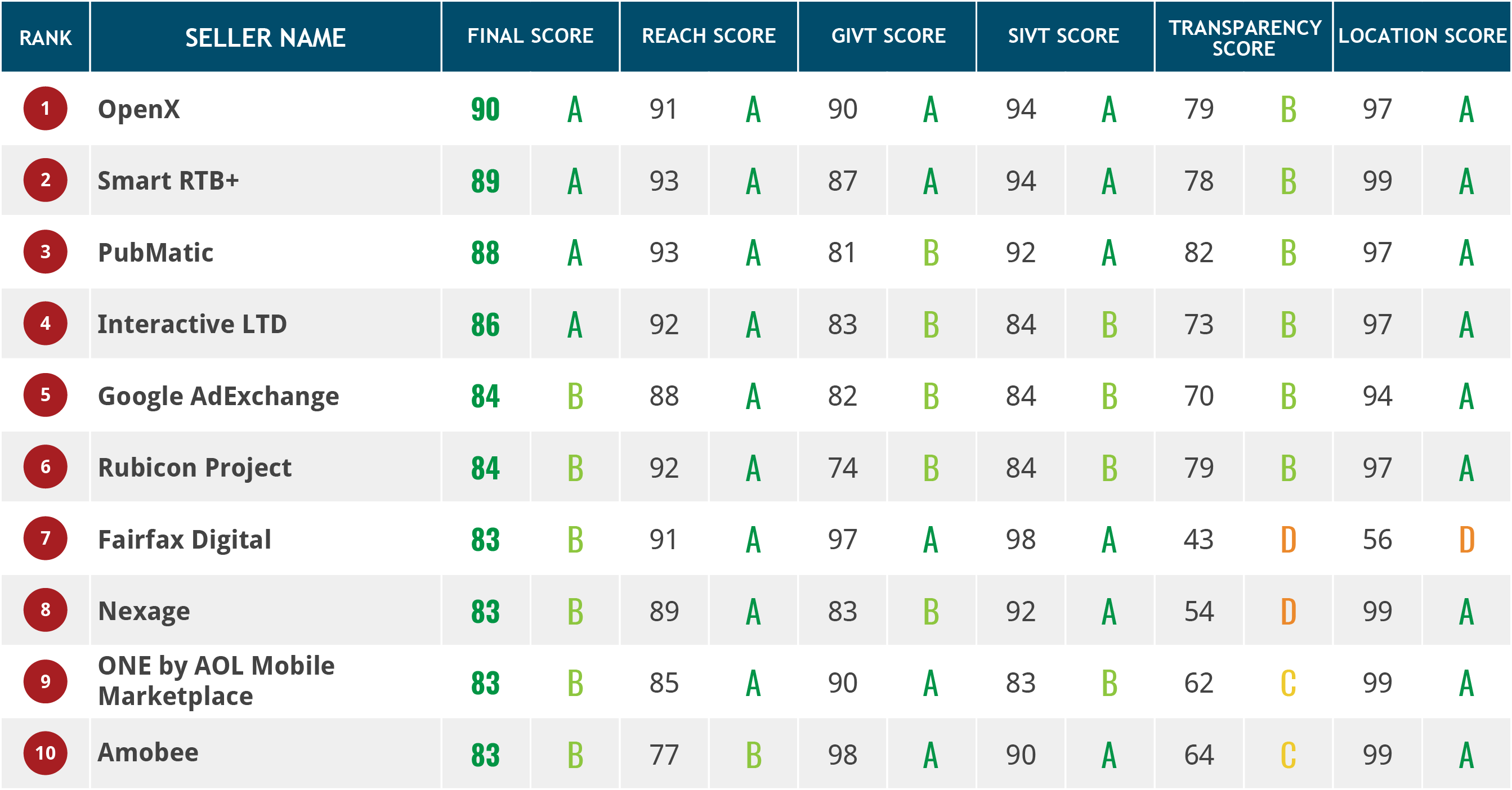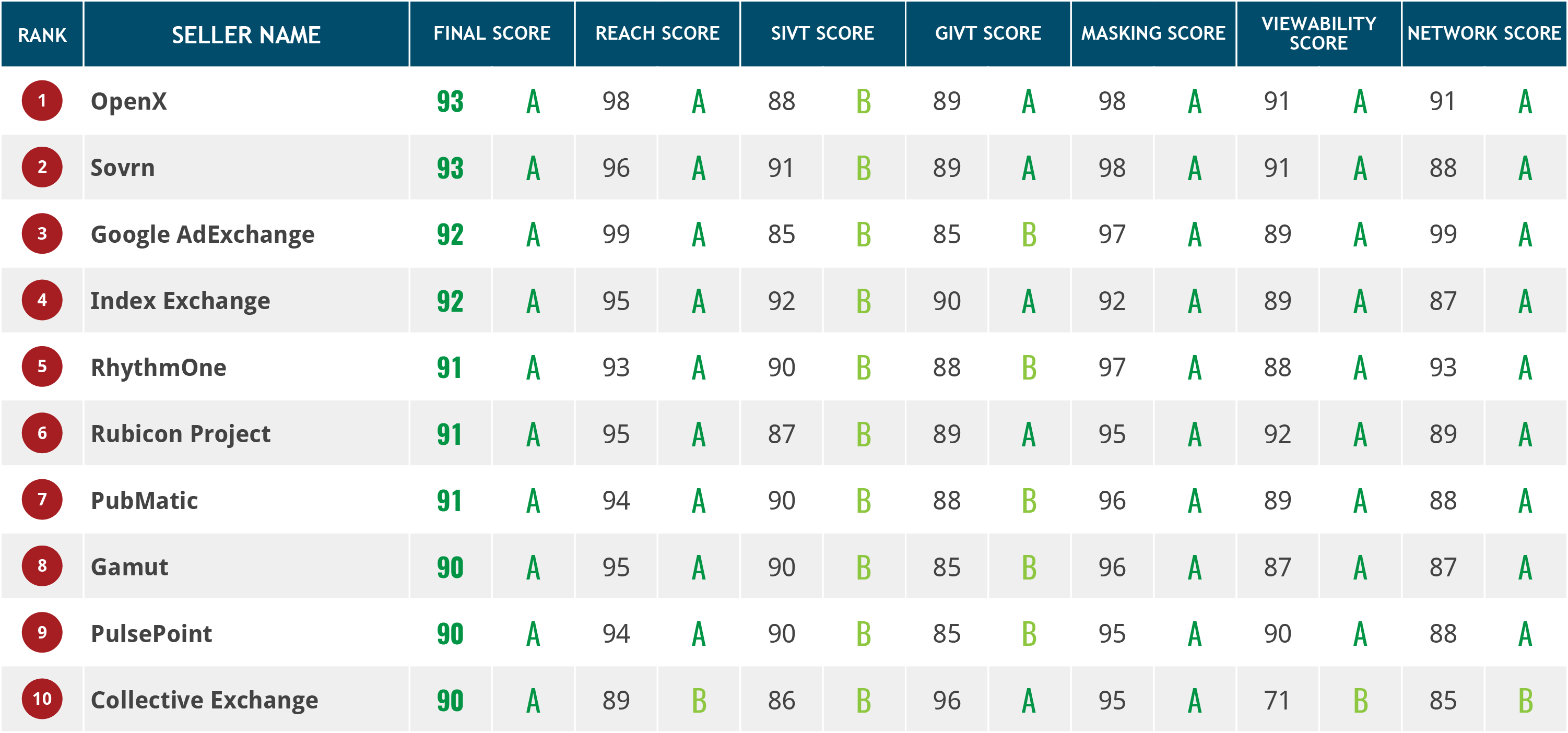 Global quality ratings are based upon an analysis of overall effectiveness assessing viewability, fraud, engagement, domain masking, and inventory scores in compliance with recognized industry standards.