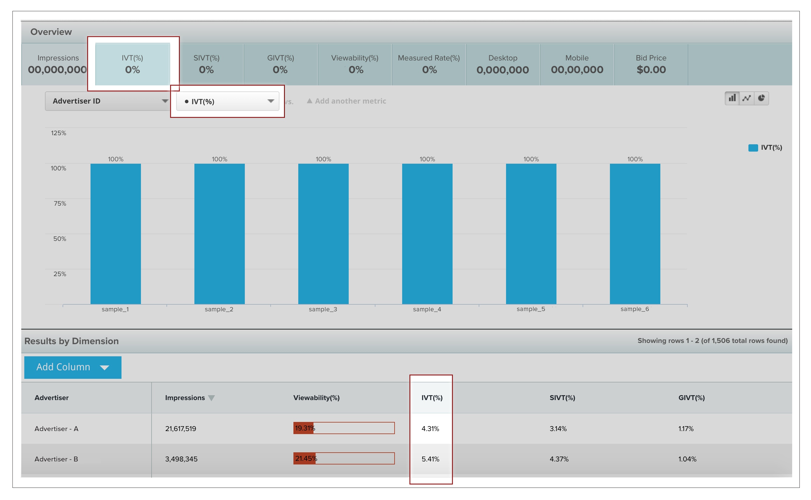 Overall Invalid Traffic (IVT), Sophisticated Invalid Traffic (SIVT) and General Invalid Traffic (GIVT) percentages are now accessible via the Analytics Dashboard.