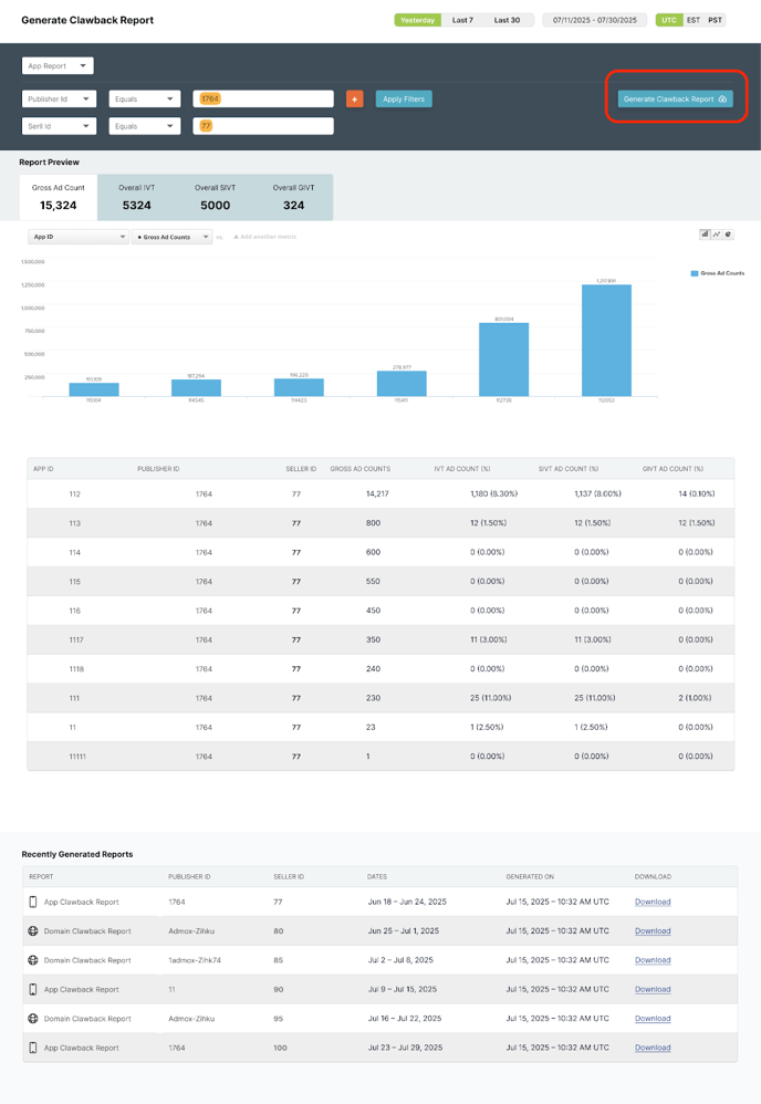 The Clawback Report feature in the Pixalate Analytics Dashboard enables users to generate official Invalid Traffic (IVT) reports for both Apps and Domains.