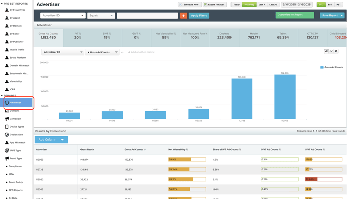 - Metrics: Gross Ad Counts, IVT Ad Count, SIVT Ad Count, GIVT Ad Count